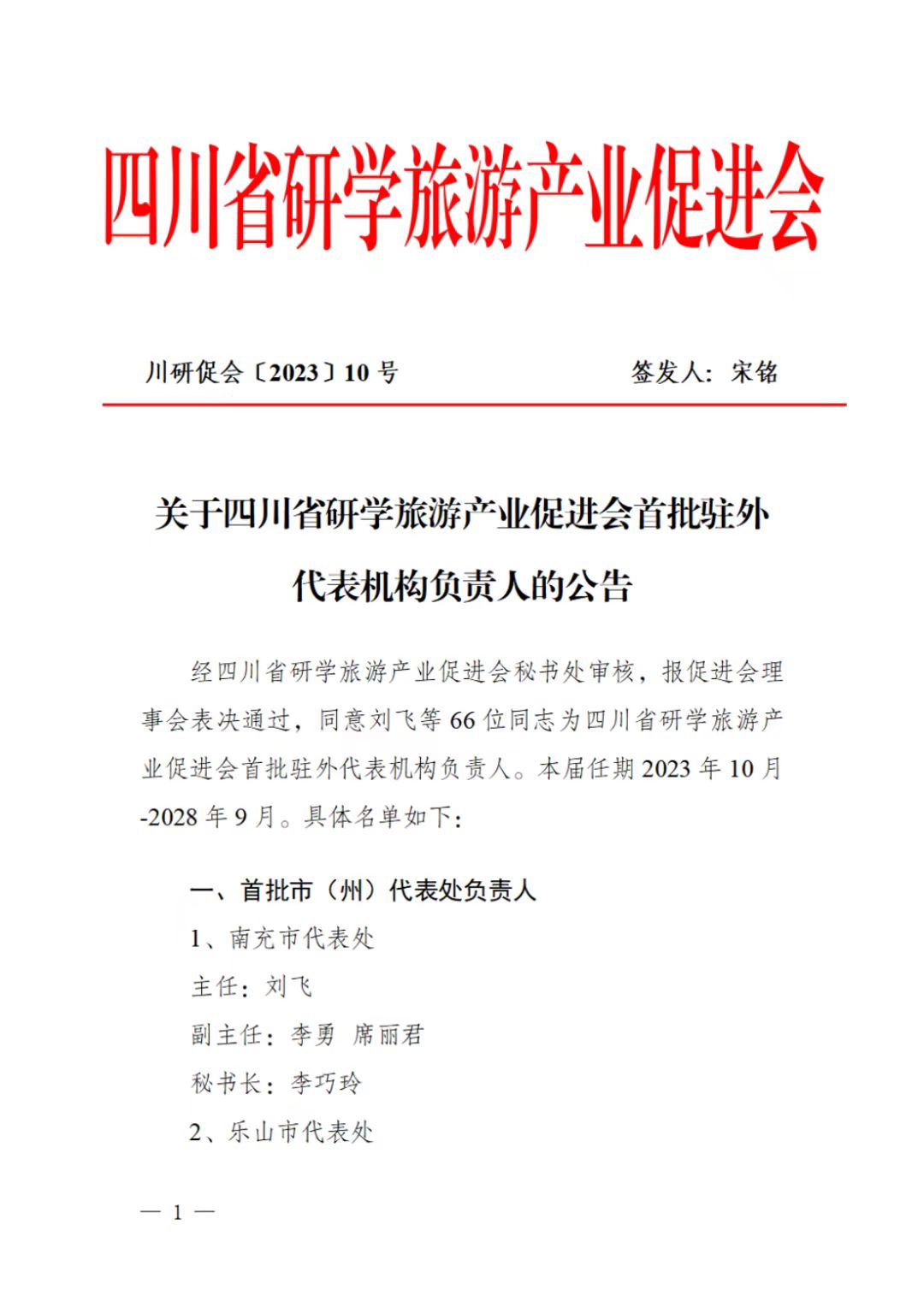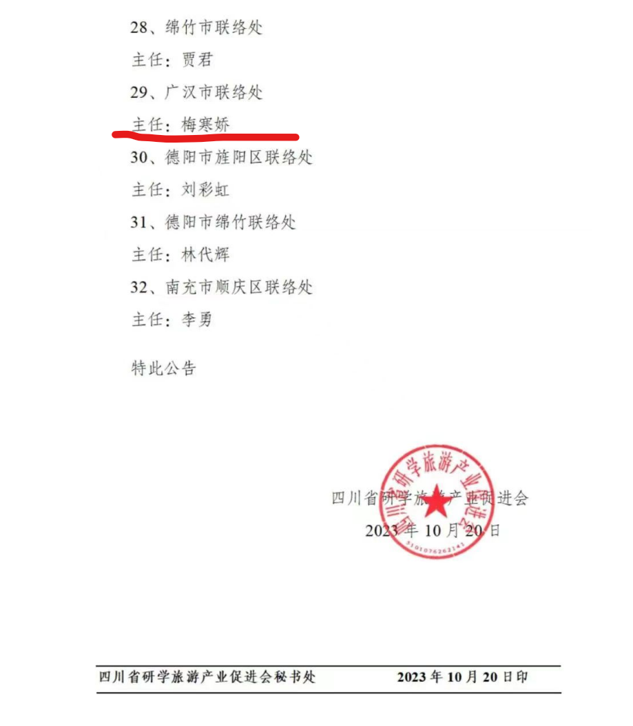 经广汉市文旅局推荐,四川省研学旅游产业促进会秘书处审核,报理事会表决通过,三星村考古探索基地负责人梅寒娇老师被选为四川省研学旅游产业促进会首批驻外代表机构负责人,作为广汉市联络处主任。本届任期:2023年10月至2028年9月。