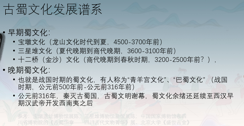 刘老师为大家梳理了三星堆文化之前和之后,成都平原上古人活动的时空脉络和文化特色。从最初旧石器时代的古人类活动,到成都平原新石器时代文化源头,特别关注了三星堆之前的有“天府之根”美誉的宝墩文化、三星堆之后的十二桥文化,以及再之后的晚期蜀文化,包括神秘的船棺葬和巴蜀图语,一直讲述到秦灭巴蜀,古蜀文化谢幕……